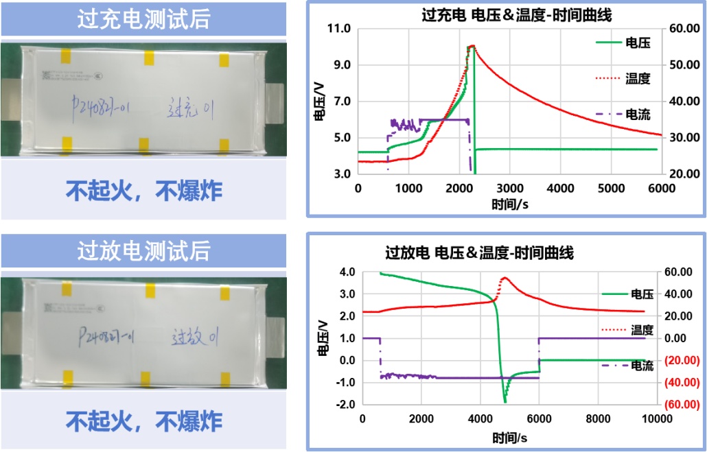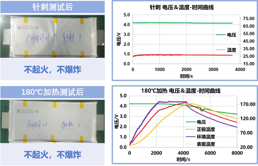 固態電池的安全突破不僅是技術改良,更是讓“絕對安全”變為可能。公司第二代固態電池安全性能滿足GB 38031-2020要求,并成功通過過充(1C充至10V)、過放(1C放電90min)、針刺和180°C熱箱測試等苛刻條件下的安全測試,未出現起火、爆炸現象,打造出真正安全的固態電池。