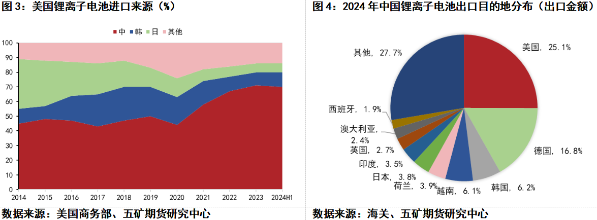同時,美國也是中國目前鋰電池出口的主要地區之一。根據海關數據,2024年,中國鋰離子電池出口第一大市場仍為美國,出口金額為153.15億美元,同比增長13%,占我國鋰離子電池出口額的25%,占比較2023年提高4.2個百分點。自2020年以來,美國已連續多年成為中國鋰電池出口的第一大目的地。