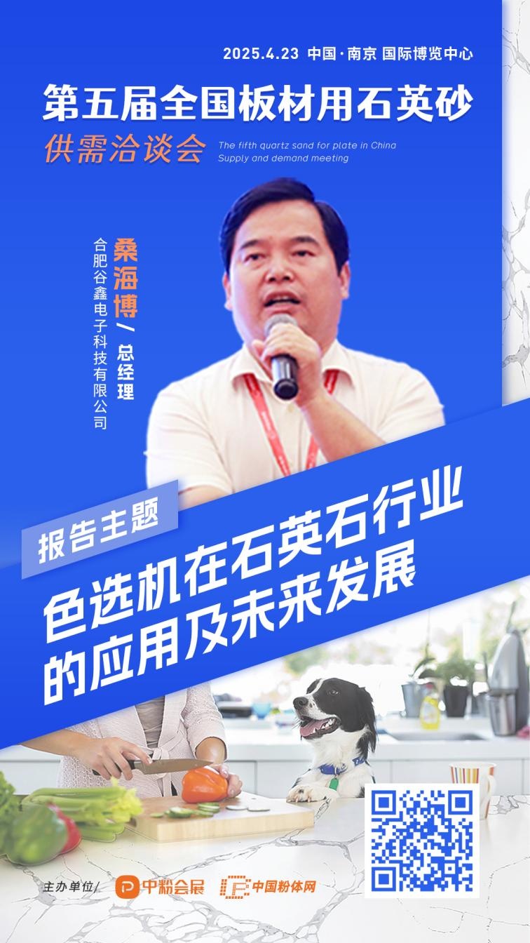 2025年4月23日,由中國粉體網、中粉會展主辦的“第五屆全國板材用石英砂供需洽談會”將在江蘇南京召開,屆時合肥谷鑫電子科技有限公司總經理桑海博將做題為《色選機在石英石行業中的應用及未來發展》的報告。