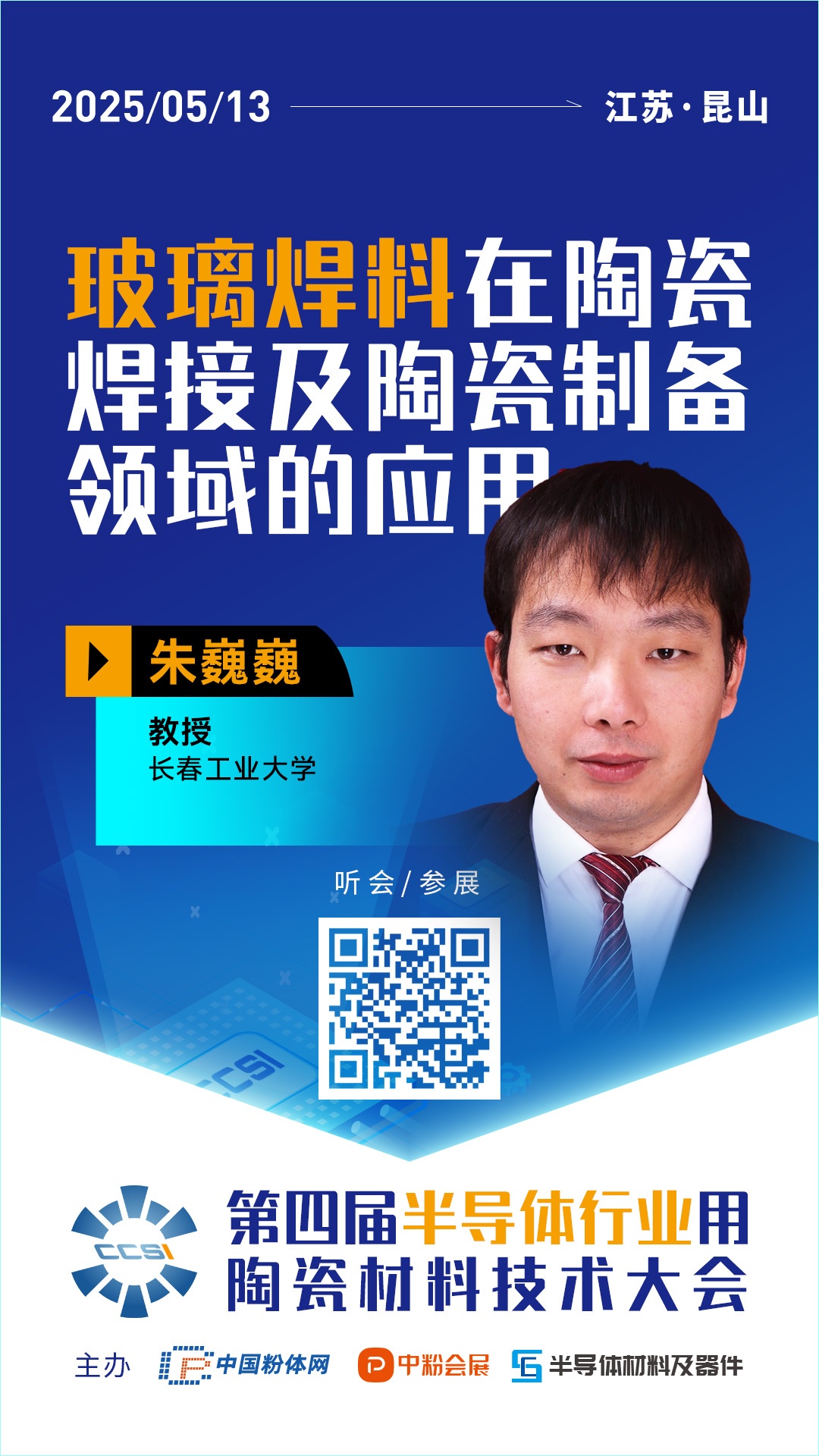 玻璃焊料在高強度氧化鋁陶瓷制備領域具有重要的應用價值。對此,中國粉體網將于2025年5月13日在江蘇昆山舉辦“第四屆半導體行業用陶瓷材料技術大會”,屆時,來自長春工業大學的朱巍巍教授將帶來題為《玻璃焊料在陶瓷焊接及陶瓷制備領域的應用》的報告,報告將為大家講述玻璃焊料在氧化鋁陶瓷大面積焊接、陶瓷制備、陶瓷裂紋修補等領域的應用。