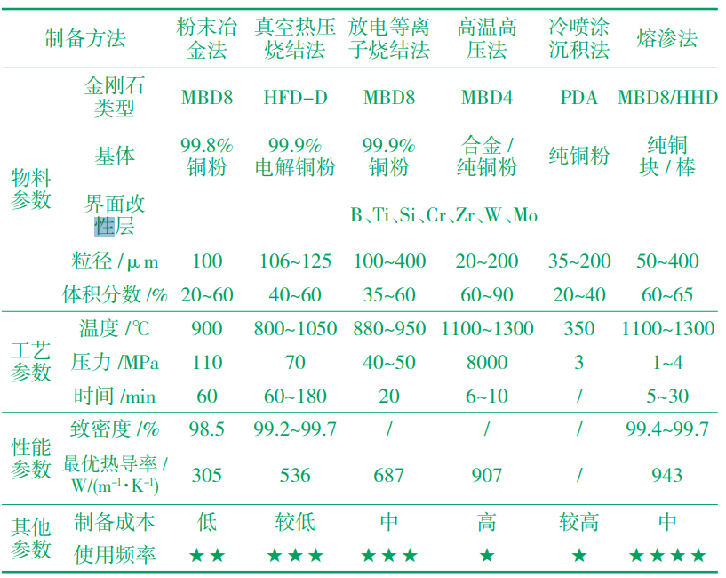 金剛石/銅常用的制備方法有:粉末冶金法、高溫高壓法、熔體浸滲法、放電等離子燒結法、冷噴涂法等。