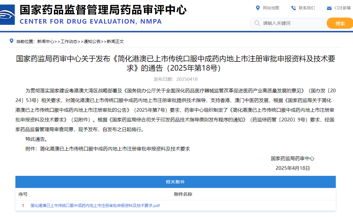 中國粉體網訊 4月18日,CDE發布《簡化港澳已上市傳統口服中成藥內地上市注冊審批申報資料及技術要求》的通告(2025年第18號),明確為港澳傳統中成藥開辟"綠色通道"。此舉旨在推動粵港澳大灣區中醫藥產業一體化,助力港澳藥企高效進入14億人口市場,同時為內地患者引入優質傳統中藥產品。