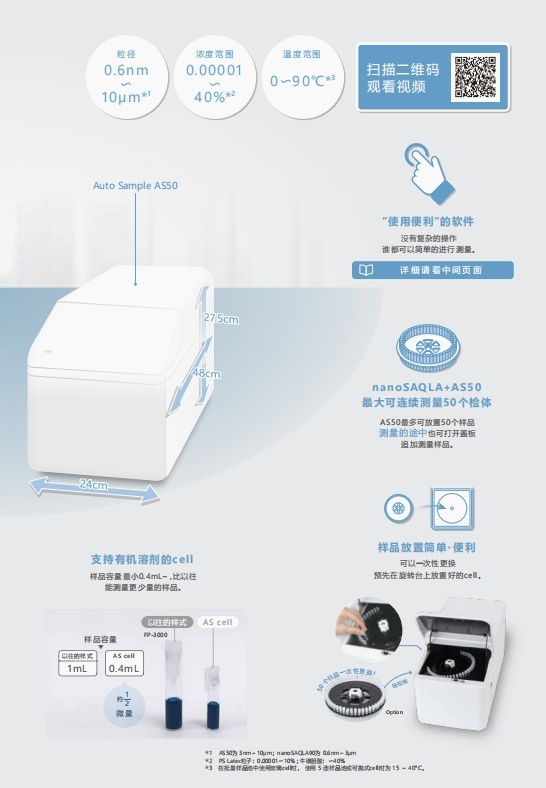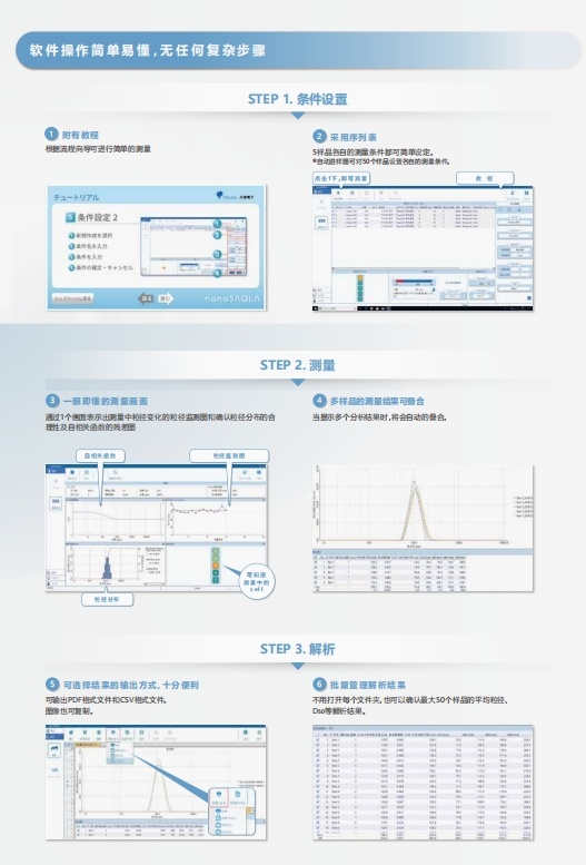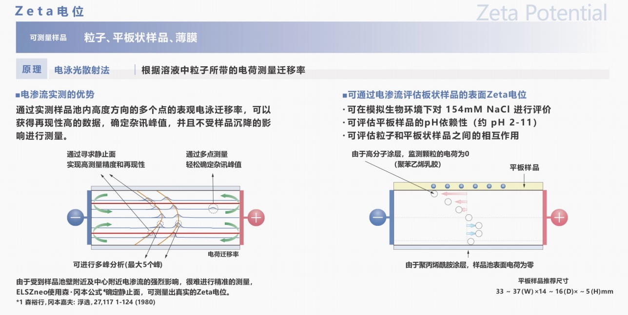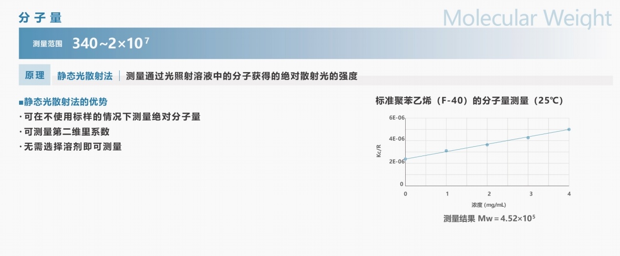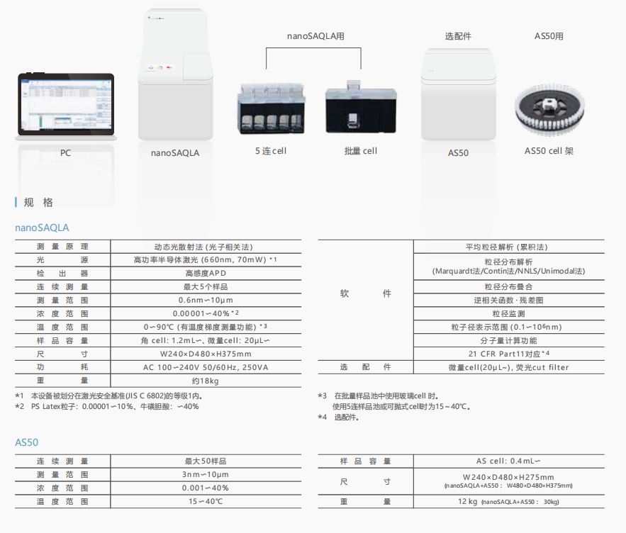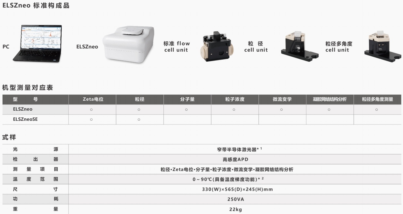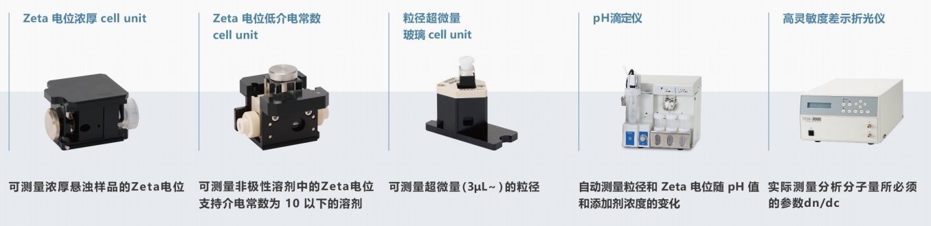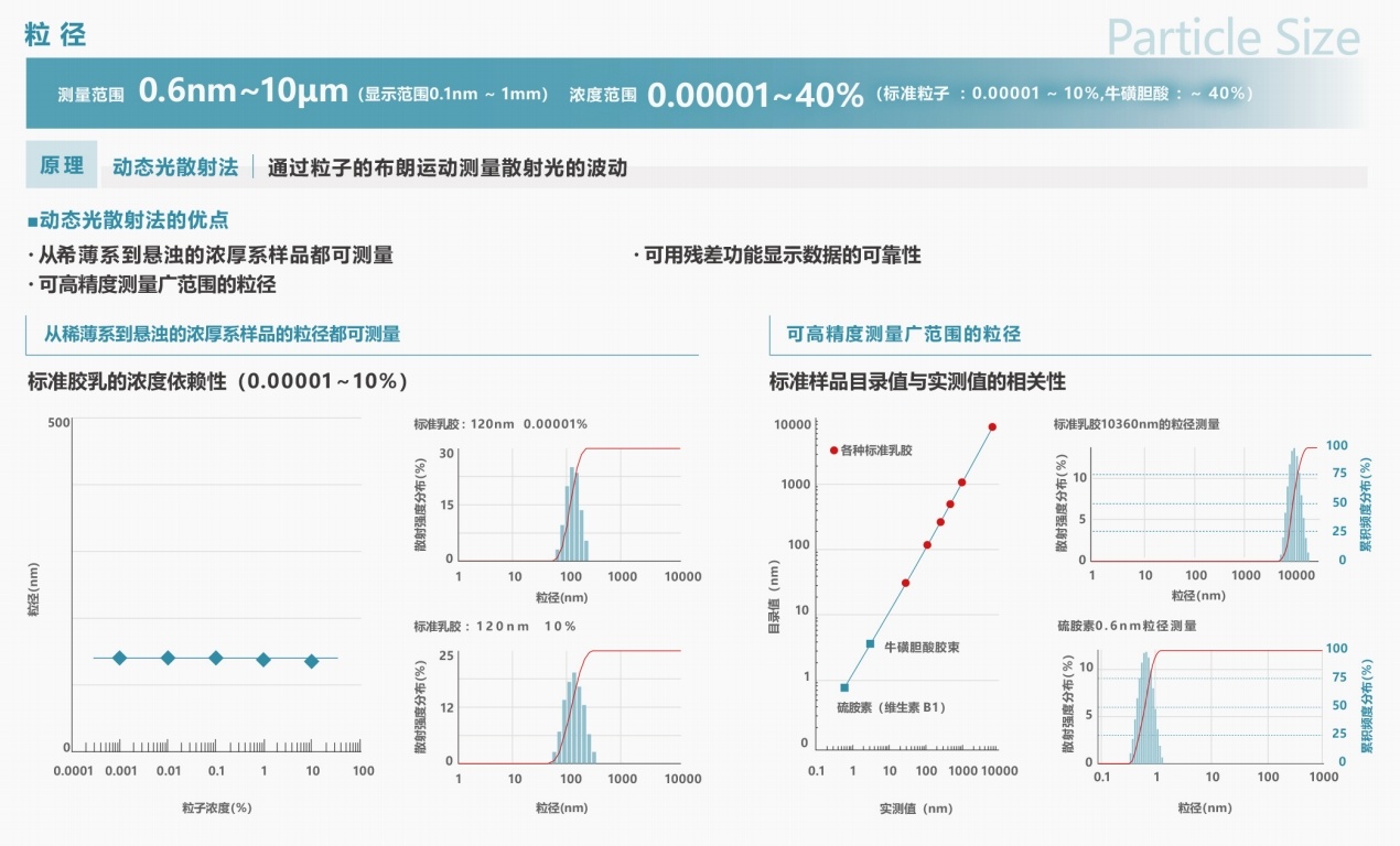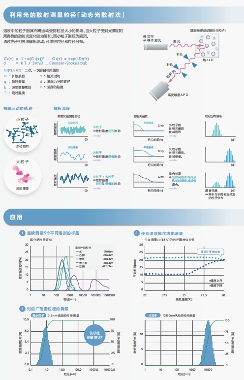 除可測量粒徑、Zeta電位和分子量外,還可進行粒子濃度、微流變學測量和凝膠網絡結構分析迄今為止難以進行樣品評價的希薄溶液、濃厚溶液、生物模擬環境下和超微量測量都可對應