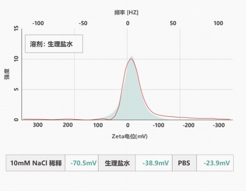 為了掌握作為DDS載體使用的脂質體在生物體內的行為,要求在生理鹽水等生物體模擬環境下進行測量,右圖評價了在10mM NaCl、生理鹽水、磷酸緩沖生理鹽水(PBS)中添加樣品時的溶劑依賴性。