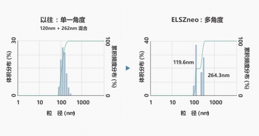 通過在3個角度(后面、側面和前面)進行動態光散射測量,可以分離相鄰的粒度分布,而這在1個角度下很難做到。下圖顯示了在3個角度測量混合了粒徑為120nm和262nm的標準乳膠的樣品的結果。