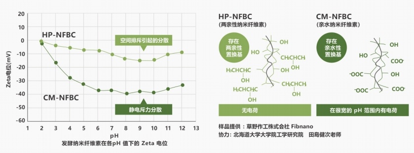 納米纖維素是一種生物質材料,具有質輕、強度高,透明等特點。為了發揮這一特性,進行化學修飾和提高分散性很重要,右圖是不同PH值下不同化學裝飾的Zeta電位評價結果。
