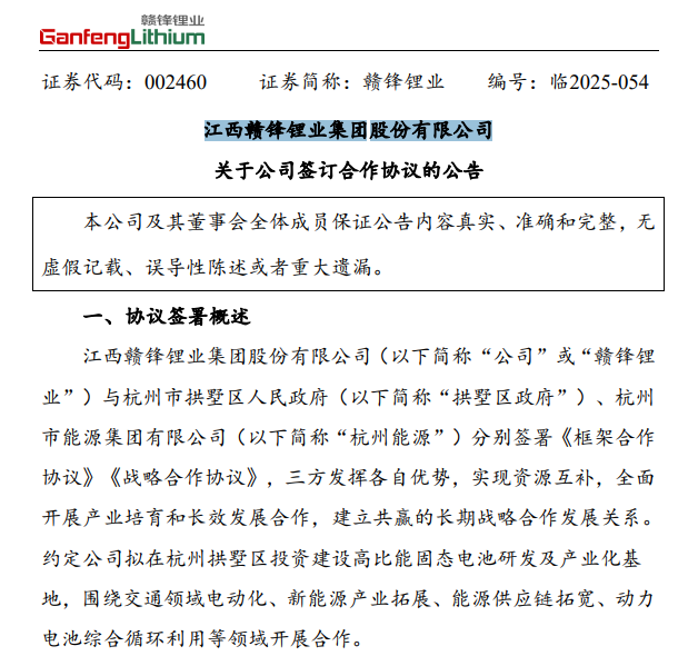 中國粉體網訊  4月26日,江西贛鋒鋰業集團股份有限公司(簡稱:贛鋒鋰業)發布公告稱,公司與杭州市拱墅區人民政府(簡稱:拱墅區政府)、杭州市能源集團有限公司(簡稱:杭州能源)分別簽署《框架合作協議》《戰略合作協議》,約定公司擬在杭州拱墅區投資建設高比能固態電池研發及產業化基地,圍繞交通領域電動化、新能源產業拓展、能源供應鏈拓寬、動力電池綜合循環利用等領域開展合作。