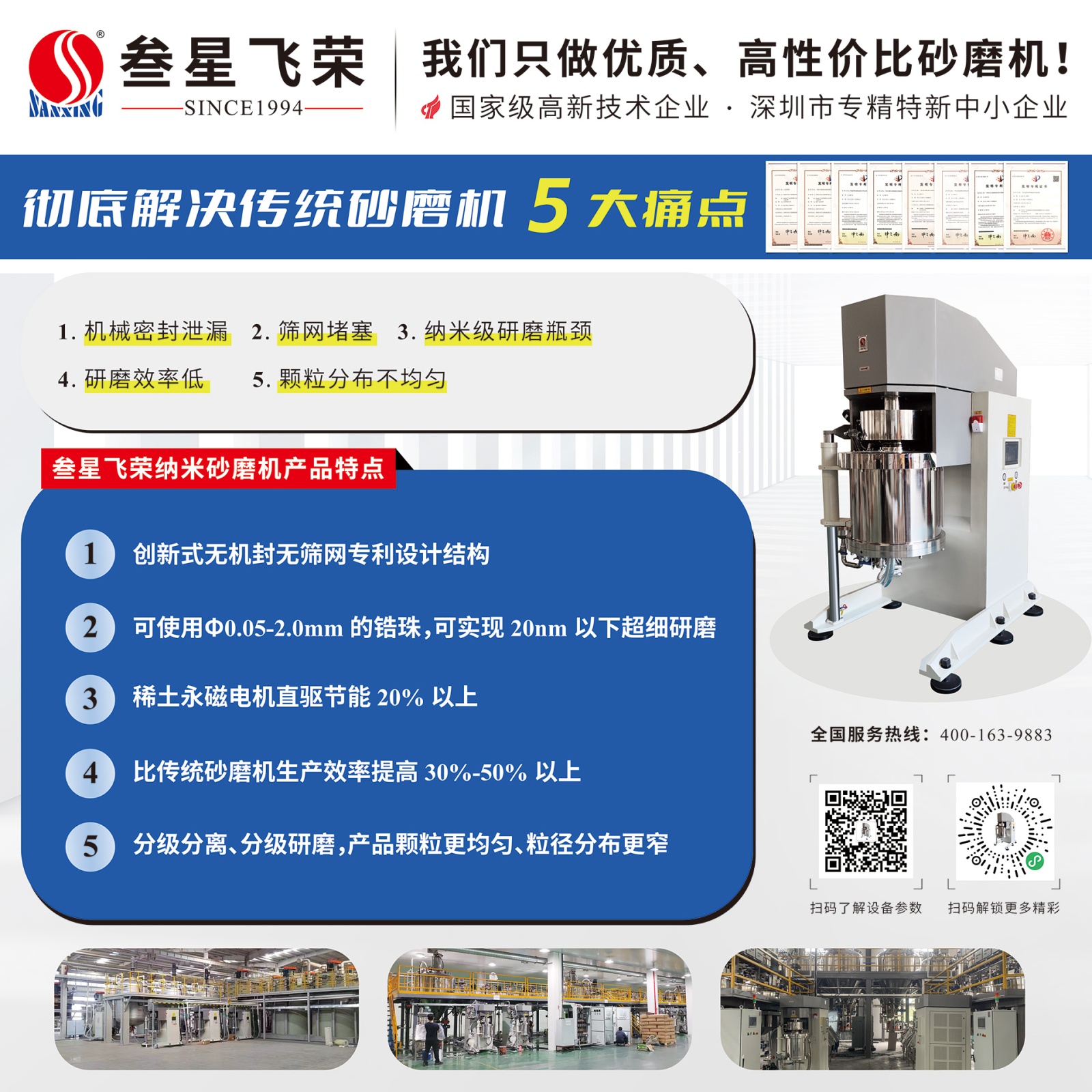 深圳市叁星飛榮機械有限公司始建于1994年,是一家為全球材料生產企業和科研機構提供粉體制備智能生產解決方案和砂磨機設備的國家級高新技術企業。