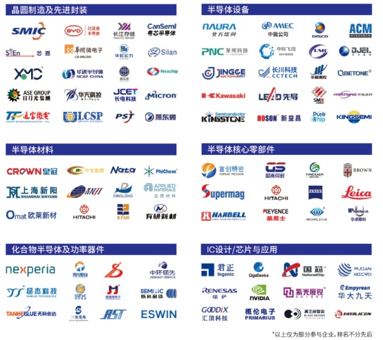 往屆展會參觀企業包括:臺積電、高塔半導體、力晶積成、聯華電子、世界先進、三星、SK海力士、中芯國際、華宏半導體、華潤微電子、粵芯、增芯、積塔半導體、士蘭微電子、方正微電子、鵬芯微、高通、英偉達、博通、海思半導體、紫光國芯、復旦微電子、北京君正、華大半導體、意法半導體、恩智浦、英飛凌、北方華創、中微公司、芯源微、長川科技、盛美半導體、中科院光電所、立訊精密、偉創力、欣旺達、京東方、TCL華星光電、國星光電、歐普照明、比亞迪汽車、小鵬汽車、理想汽車、小米汽車等(僅為部分企業名單,排名不分先后)
