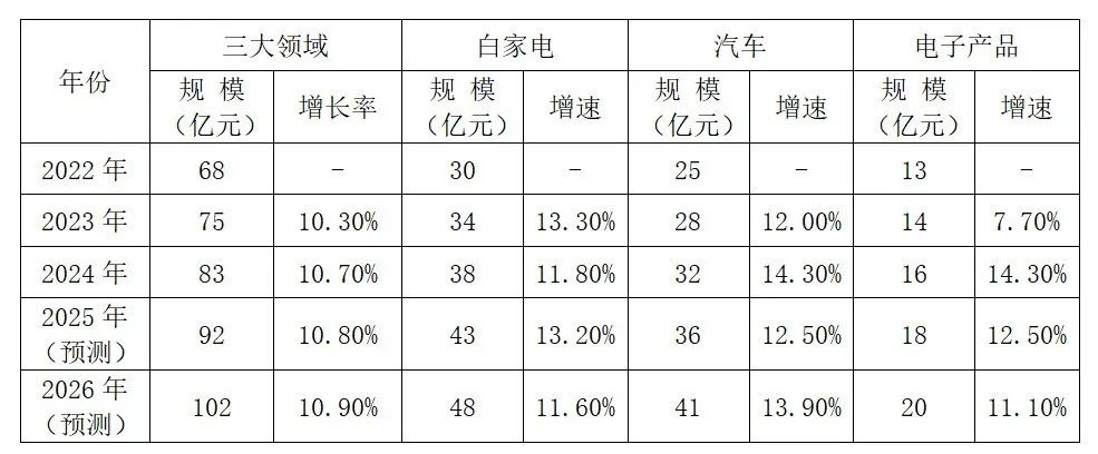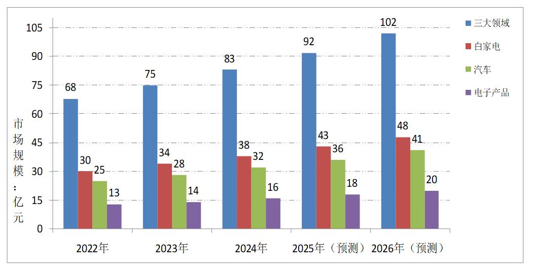 中國粉體網訊 當前我國功能母粒市場被持續看好,根據多家業內機構及中國塑料加工工業協會(CPPIA)披露的相關信息得知,2022~2026年我國功能色母粒在白家電、汽車及電子產品三大領域的市場規模較大,增長率較為明顯。