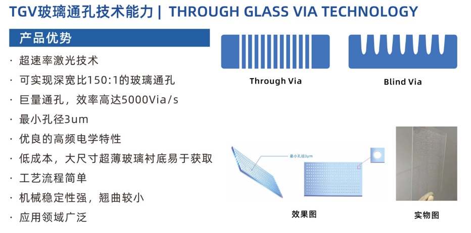 在半導體先進封裝領域同樣成效顯著,沃格光電子公司通格微有著全球領先的TGV玻璃基板加工能力(玻璃基通孔、RDL線路導通以及SAP雙面多層線路堆疊技術),已實現通孔孔徑最小至3微米,深徑比高達150:1,支持高達四層的線路堆疊,可替代傳統硅基TSV技術的玻璃基TG技術,該技術能廣泛應用在高算力芯片、射頻器件、直顯基板、微流控芯片等領域,為新型顯示、半導體先進封裝及5G/6G通信行業提供高性能的玻璃基線路板解決方案。