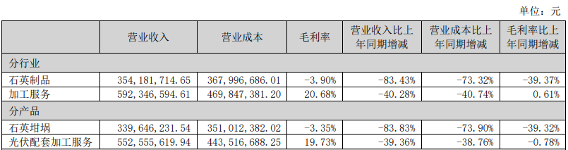 石英股份2024年年度業績報告顯示,公司營業收入約12.1億元,同比減少83.15%;歸屬于上市公司股東的凈利潤約3.34億元,同比減少93.38%;基本每股收益0.62元,同比減少93.33%。