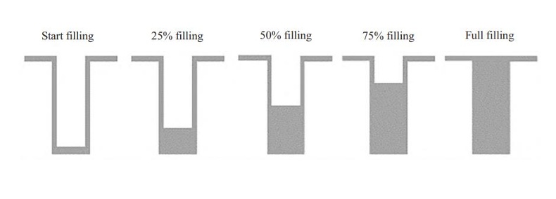 目前,對于TGV盲孔的主要填充方式是自上而下的填充。通過在TGV孔口側壁及表面添加抑制劑,在盲孔底部添加加速劑的方式,抑制TGV孔口側壁及表面銅沉積速度的同時,加速盲孔底部的銅沉積,從而讓銅形成一種自下而上的填充方式來確保整個盲孔的填充過程中沒有孔洞和縫隙的出現。