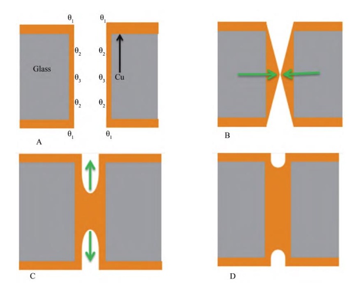 共形填充是通過添加劑的作用使得TGV孔內銅的沉積速率與孔的側壁以及表面的沉積速率相當的一種電鍍方式。對于垂直的盲孔與通孔,共形填充模式下隨著填充過程的進行,其深寬比不斷增大,在填充的最后階段容易出現孔洞缺陷,而X形、V形通孔由于其自身特殊孔形的原因,從根本上避免了中央孔洞缺陷的形成,例如,X形通孔的中間區域較窄,在兩側銅等速沉積的情況下會先于通孔中央形成連接,然后逐步向上下兩個方向進行類似自上而下的填充。相比于垂直通孔的蝶形填充電鍍模式,共形填充的電鍍模式由于加速劑的使用以及TGV孔形的原因,可以實現更大電流密度下通孔的完整快速填充。