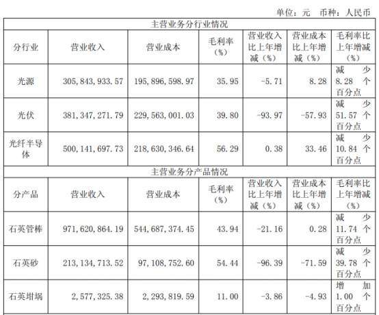 石英砂作為高純石英業務的重要產品,銷售收入為213,134,713.52元,同比減少96.39%,占公司主營收入的17.95%,石英砂營業成本為97,108,752.60元,同比減少71.59%,石英砂毛利率為54.44%,同比減少39.78個百分點。