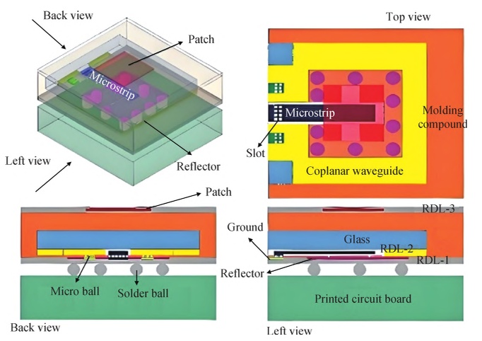 劉佳豪等提出了一種基于玻璃基板嵌入技術的扇出天線封裝結構,通過在單面或雙面玻璃基板上嵌入再布線層技術來增加設計靈活性和改善天線輻射性能,最終得到了兩種優化的天線設計,一種是具有7.6GHz帶寬和4.7dB增益的向上輻射天線,另一種是具有5.3GHz帶寬和5.2dB增益的向下輻射天線。玻璃基板在該創新封裝中發揮了關鍵作用,適用于5G毫米波和其他高頻通信應用。