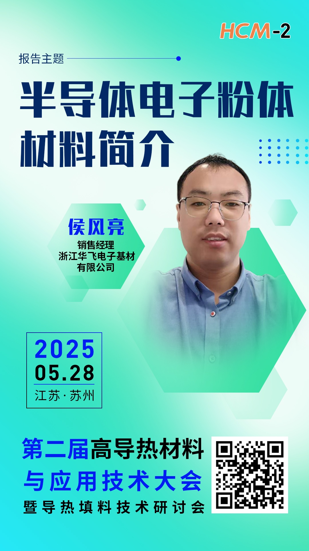 2025年5月28日,中國粉體網將在江蘇·蘇州舉辦“第二屆高導熱材料與應用技術大會暨導熱填料技術研討會”。屆時,我們邀請到浙江華飛電子基材有限公司銷售經理侯風亮出席本次大會并作題為《半導體電子粉體材料簡介》的報告。本報告將重點闡述球形二氧化硅、球形氧化鋁等半導體電子粉體的特性指標及其在集成電路、電子封裝等主要應用領域的作用,詳細介紹華飛高純球形導熱氧化鋁在提升電子設備散熱性能方面的顯著優勢及相關應用案例。