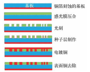 PTE工藝首先刻蝕基板下側(cè)銅箔,并使用真空壓膜機在基板上側(cè)壓合感光膜,采用物理氣相沉積(PVD)分別沉積Ti和Cu作為阻擋層和種子層,接著采用電鍍工藝填充溝槽,溝槽填充完后,使用化學腐蝕劑刻蝕掉上表面的銅從而露出線路。