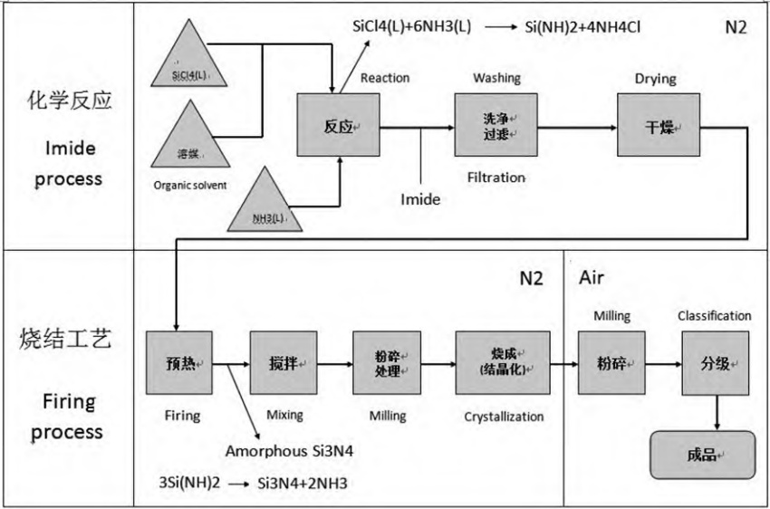 液相反應法(又稱硅亞胺化學分解法)制備的氮化硅粉具有極高的α相含量,并且燒結活性優異。但該方法制備難度大,技術門檻高,對原料的純度要求高,其難點在于不易獲得穩定的固態亞氨基硅(Si(NH)2)。目前,這種方法已經成為商業化高純高質量氮化硅粉體生產所使用的最主要的方法。日本UBE公司是最早使用該方法規模化生產出性能優異、質量穩定的氮化硅粉體產品的廠商。