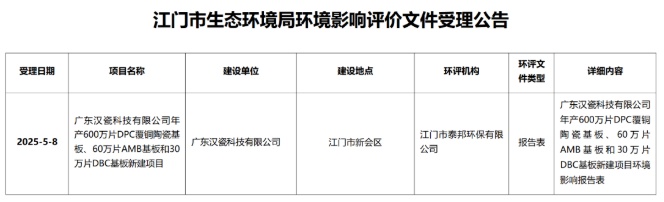 中國粉體網訊 近日,廣東漢瓷科技有限公司(以下簡稱“漢瓷科技”)年產600萬片DPC覆銅陶瓷基板、60萬片AMB基板和30萬片DBC基板新建項目環境影響報告披露。