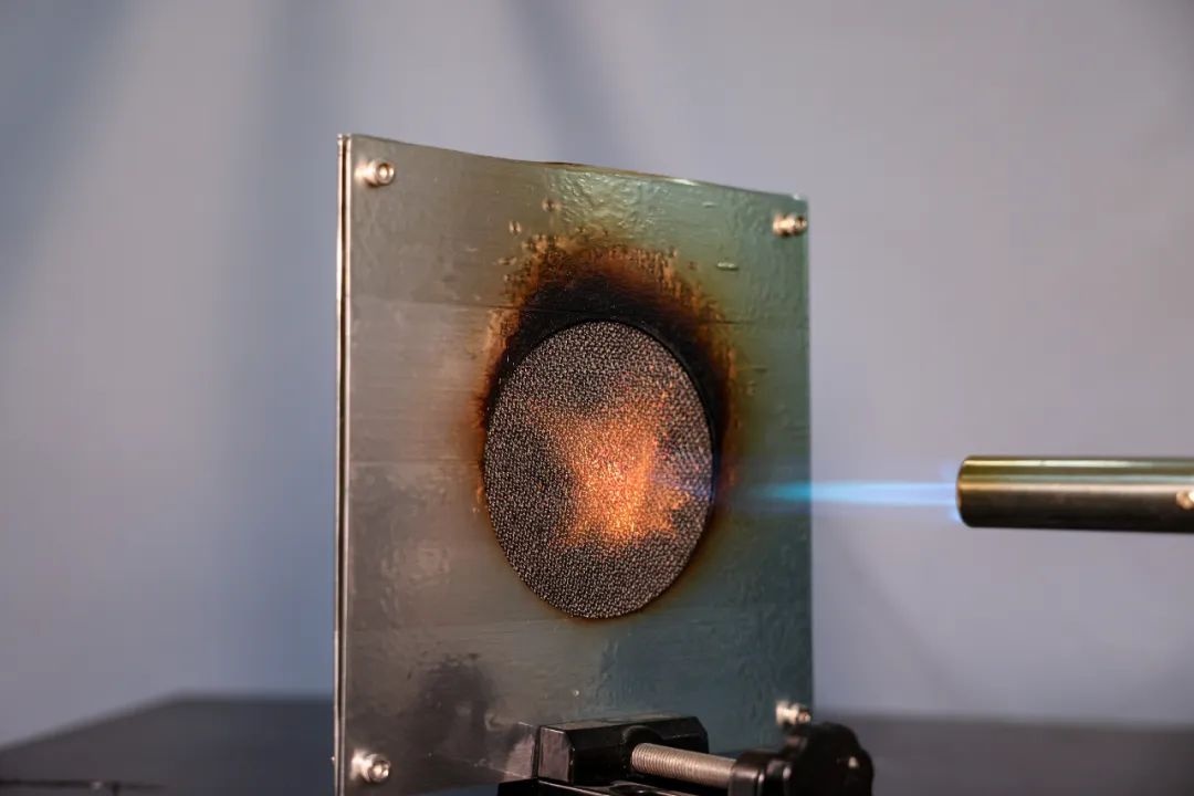 由玄武巖纖維再加工制作的面料,用1200℃的火槍噴10秒無明顯變化。記者胡冬冬攝