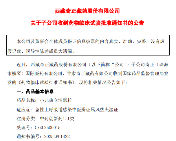 小兒熱立清顆粒臨床申請(受理號:CXZL2500015)于2025年3月獲得CDE承辦受理,并于近日順利獲批臨床,用于急性上呼吸道感染。據報道,小兒熱立清為全國名中醫張士卿教授臨床經驗方,由蒿芩清膽湯靈活加減而得。2017年與甘肅省中藥現代制藥工程研究院有限公司(奇正藏藥全資子公司)合作開展小兒熱立清院內制劑和新藥研發。