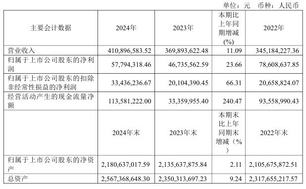 2024年,公司實現營業總收入41,089.66萬元,同比增長11.09%;實現歸屬于母公司所有者的凈利潤5,779.43萬元,同比增長23.66%;實現歸屬于母公司所有者的扣除非經常性損益的凈利潤3,343.62萬元,同比增長66.31%;扣除非經常性損益后的基本每股收益0.08元,同比增長60.00%。