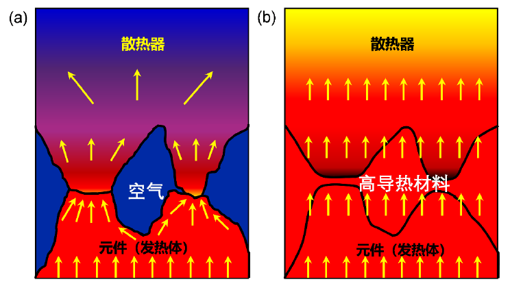 熱界面材料填充于固體表面缺陷之間的界面間隙,有效地排除空氣,使得產熱元器件與散熱器件之間的接觸更加密切,大大降低了界面接觸熱阻,建立起了高效的熱傳遞通道,從而使得散熱器件的工作效率得到了最大化的提升。