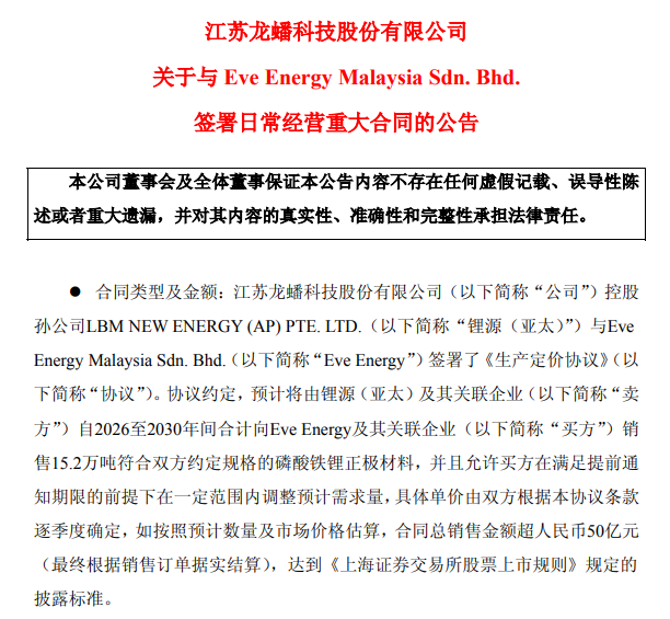 中國粉體網訊 6月3日,龍蟠科技發布公告,控股孫公司LBMNEWENERGY(AP)PTE.LTD.(簡稱“鋰源(亞太)”)與EveEnergyMalaysiaSdn.Bhd.(簡稱“EveEnergy”)簽署《生產定價協議》,預計自2026至2030年間向EveEnergy及其關聯企業銷售15.2萬噸磷酸鐵鋰正極材料,并且允許買方在滿足提前通知期限的前提下,在一定范圍內調整預計需求量。具體單價由雙方根據協議條款,逐季度確定。如按照預計數量及市場價格估算,合同總銷售金額預計超50億元。