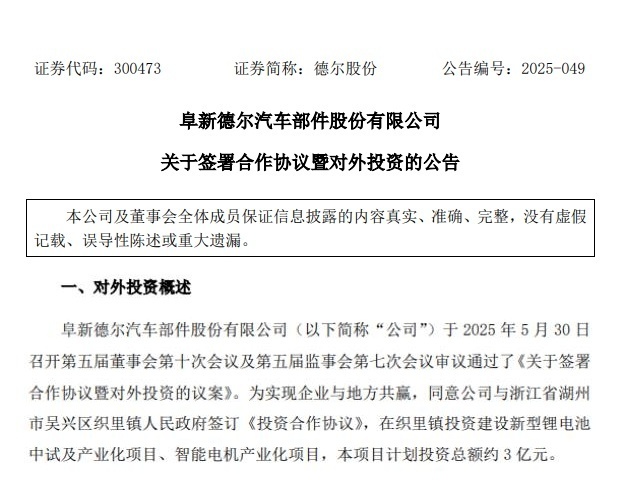 中國粉體網訊  5月30日,阜新德爾汽車部件股份有限公司(簡稱:德爾股份)就項目落地浙江省湖州市吳興區簽訂了相關《投資合作協議》,計劃斥資約3億元建設固態電池中試及產業化項目、智能電機產業化項目。