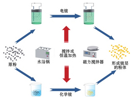 鍍層技術在金屬粉體表面改性方面應用廣泛,該方法包括電鍍、化學鍍,通過對金屬顆粒表面鍍膜,以提升目標粉末相關性能。電鍍就是利用電解原理在某些金屬表面上鍍上一薄層其他金屬或合金的過程;而化學鍍是一種不需要外加電流,直接在工件表面實現鍍膜的技術,化學鍍最大的優勢在于能夠在不加外加電源的情況下,制得具有均一致密涂層的金屬粉體,非常適合金屬元素的添加。