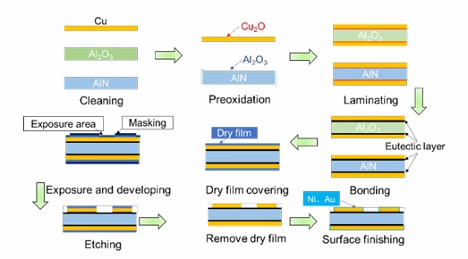 AMB陶瓷基板是DBC工藝的進一步發展,該工藝通過含有少量稀土元素的焊料來實現陶瓷基板與銅箔的連接,其鍵合強度高、可靠性好。該工藝相較于DBC工藝鍵合溫度低、易操作。