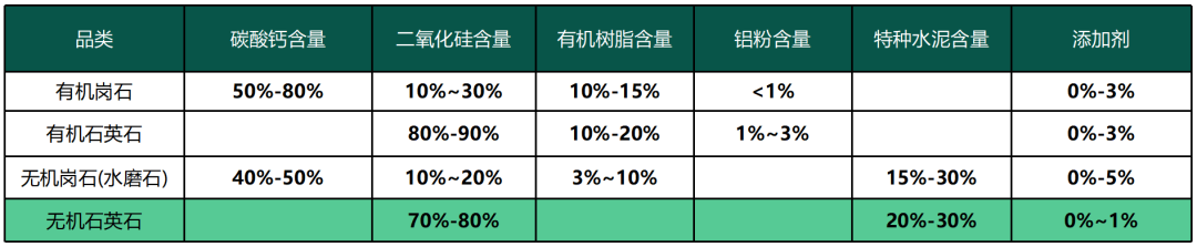 根據骨料類型,無機人造石可分為無機石英石和無機崗石。無機石英石主要是以SiO2為主,如石英、硅砂、花崗石等的石材碎料、粉體為骨料,無機崗石是以碳酸鹽類,如石灰石、大理石等石材碎料、粉體為骨料。由于石英是一種非常堅硬的礦物,其莫氏硬度為7,因此,一般來說,無機石英石的強度、表面質量、耐久性都優于無機崗石。