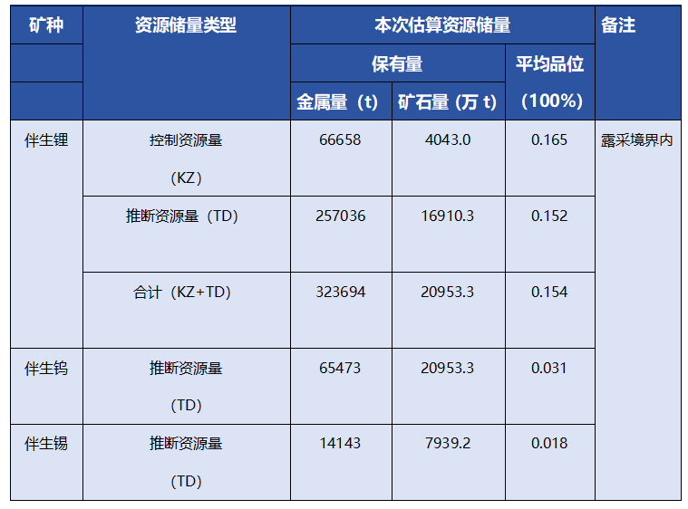 桂陽縣大沖里礦區本次通過評審備案的伴生鋰的長石礦礦石量為20,953.3萬噸,Li2O(氧化鋰)礦物量為32.37萬噸(平均品位0.154%),WO3(三氧化鎢)礦物量為6.55萬噸(平均品位0.031%),Sn(錫)礦物量為1.41萬噸(平均品位0.018%)。