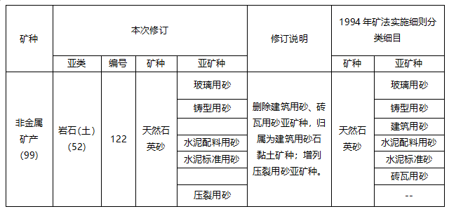 新舊礦產資源目錄對照表(天然石英砂部分)