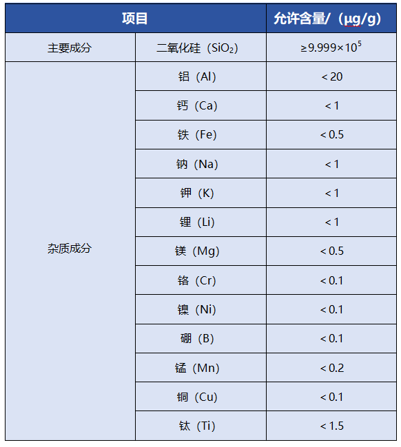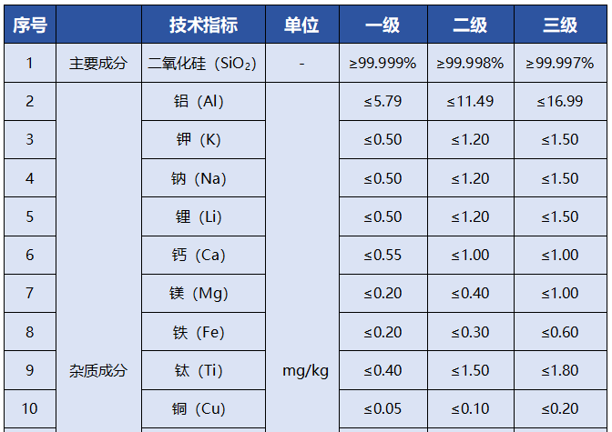 由浙江美晶新材料股份有限公司、寧夏鑫晶新材料科技有限公司、遼寧拓邦鴻基半導體材料股份有限公司、江蘇泓順硅基半導體科技有限公司共同起草的T/QGCML 4167—2024《半導體石英坩堝生產用高純石英砂》團體標準規定了半導體石英坩堝生產用高純石英砂的術語和定義、技術要求等,文件適用于半導體石英坩堝生產用高純石英砂。其中,高純石英砂中二氧化硅含量應≥99.998%。