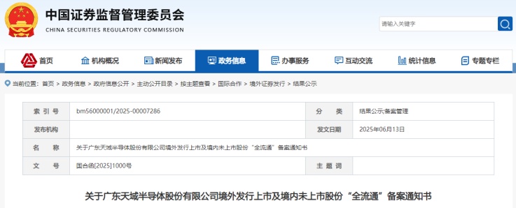 中國粉體網(wǎng)訊 6月13日,中國證監(jiān)會發(fā)布公告,廣東天域半導體股份有限公司(以下簡稱“天域半導體”)正式通過境外發(fā)行上市及“全流通”備案,計劃發(fā)行不超過4640.8萬股H股,17名股東持有的2891.9萬股境內(nèi)股份將轉(zhuǎn)為港股流通。