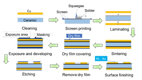 在AMB工藝流程中,首先,在潔凈的陶瓷基板上涂覆一層薄薄的焊料,隨后將銅箔貼合在焊料上并放置在800℃至950℃的真空環境下使焊料熔化,待焊料冷卻后即可形成穩固的連接。接下來,通過濕法刻蝕技術制作金屬圖案以滿足大功率器件的電氣連接需求。