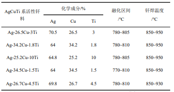 部分商用Ag-Cu-Ti釬料牌號及成分