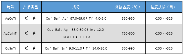系、AgCuTiB系、AgSnTi系、AgCuTiIn系、AgCuSnNi系等幾十類釬料。
