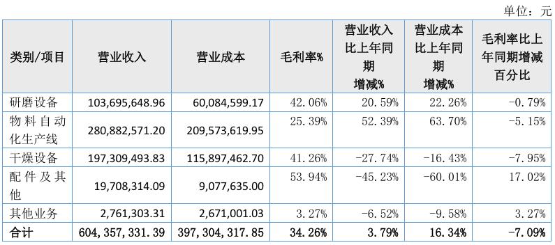 年報顯示,公司的主營業(yè)務(wù)收入由研磨設(shè)備、物料自動化生產(chǎn)線、干燥設(shè)備、配件及其他構(gòu)成。