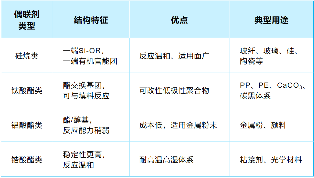 鋯類偶聯(lián)劑是含鋁酸鋯的低分子量的無機聚合物。它不僅可以促進不同物質(zhì)之間的粘合,而且可以改善復(fù)合材料體系的性能,特別是流變性能。該類偶聯(lián)劑既適用于多種熱固性樹脂,也適用于多種熱塑性樹脂。此外還有鎂類偶聯(lián)劑和錫類偶聯(lián)劑。