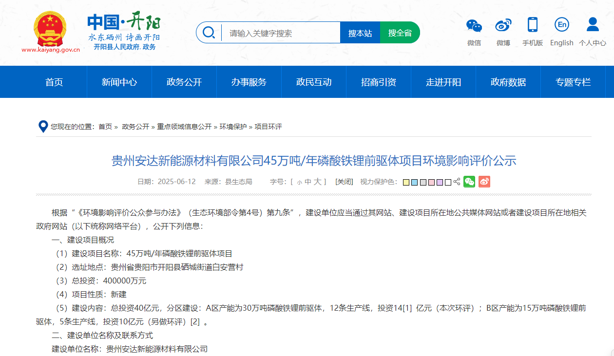 中國粉體網訊 近日,據開陽縣人民政府網消息,貴州安達新能源材料有限公司45萬噸/年磷酸鐵鋰前驅體項目環境影響評價正式公示。