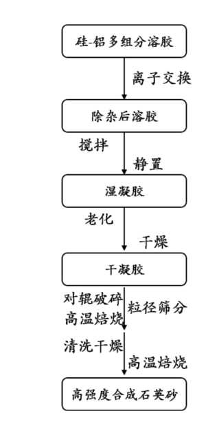 江蘇鑫華半導(dǎo)體科技股份有限公司公布了一種高強(qiáng)度人工合成石英的制備方法,包括以下步驟,步驟1:得到硅‑鋁多組分溶膠;步驟2:將硅‑鋁多組分溶膠通過離子交換柱,得到處理液;步驟3:將處理液轉(zhuǎn)入反應(yīng)釜中,進(jìn)行攪拌;步驟4:攪拌結(jié)束后,靜置,得到濕凝膠;步驟5:將濕凝膠用高純水浸泡并清洗;步驟6:將清洗后的濕凝膠進(jìn)行干燥,得到干凝膠;步驟7:干凝膠使用輥式破碎機(jī)粉碎;步驟8:將干凝膠放入回轉(zhuǎn)爐中進(jìn)行燒結(jié),得到石英砂;步驟9:將石英砂進(jìn)行超聲清洗,隨后干燥;步驟10:將干燥后的石英砂進(jìn)行焙燒,得到人工合成石英;選擇合理的鋁源以形成均勻凝膠結(jié)構(gòu),從而制備高純度、高均勻性、高強(qiáng)度的合成石英砂。