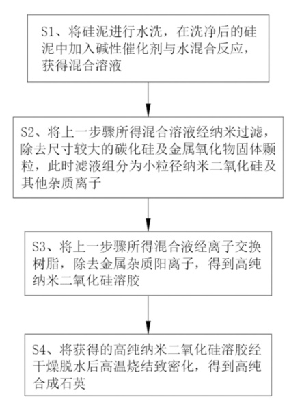 江蘇德鑫新材料科技有限公司公布了一種利用硅泥制備高純合成石英的方法,包括以下步驟:將硅泥進(jìn)行水洗,在洗凈后的硅泥中加入堿性催化劑與水混合反應(yīng),獲得混合溶液;將上一步驟所得混合溶液經(jīng)納米過濾,除去尺寸較大的碳化硅及金屬氧化物固體顆粒,此時濾液組分為小粒徑納米二氧化硅及其他雜質(zhì)離子。本發(fā)明在對硅泥處理時無需使用酸洗的方式對硅泥進(jìn)行預(yù)處理,使得制備過程中無廢酸廢水排放,工藝簡單,對環(huán)境友好,且硅泥中雜質(zhì)采用多級過濾膜組物理依次去除方式分離,分離成本低,且不影響金屬氧化物、碳化硅的再回收利用,資源利用更加充分合理,目標(biāo)高純合成石英中無碳化硅夾雜,純度更高。