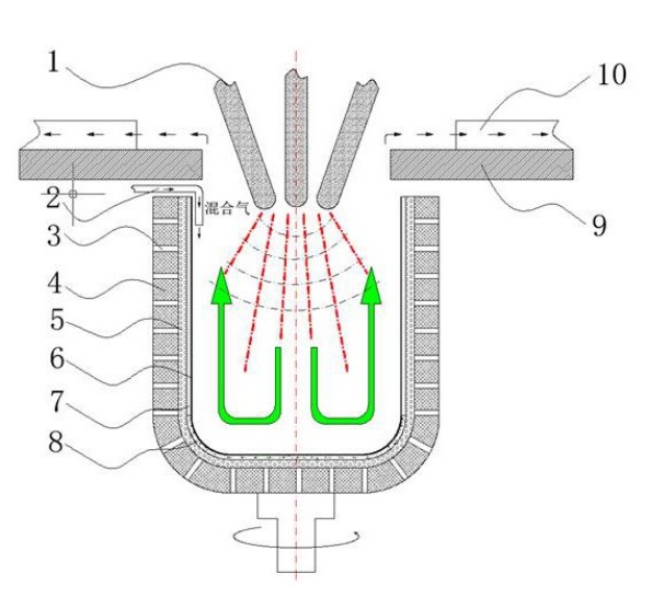 江蘇亨芯石英科技有限公司公布了一種多噴燈CVD合成大尺寸石英玻璃的方法,包括如下步驟:噴燈點(diǎn)火對爐膛進(jìn)行預(yù)熱升溫;向每個噴燈通入氫氣、氧氣和四氯化硅,至爐膛內(nèi)的溫度和壓力處于穩(wěn)定狀態(tài);增大每個噴燈的氫氣、氧氣和四氯化硅的通入流量,驅(qū)動承載體旋轉(zhuǎn)并提升至基準(zhǔn)點(diǎn)開始沉積至承載體深度的90%;停止外環(huán)噴燈的四氯化硅通入,繼續(xù)在沉積坨表面沉積至目標(biāo)高度;停止原料通入,自然冷卻后卸坨。本發(fā)明采用呈內(nèi)環(huán)、中環(huán)和外環(huán)設(shè)置的多組噴燈,噴燈火焰互不干涉,可精確控制爐溫分布,提高了大尺寸合成石英坨的均勻性,同時提高了預(yù)熱效率和沉積效率;控制穩(wěn)定沉積兩個階段不同環(huán)噴燈的原料供應(yīng),實(shí)現(xiàn)大尺寸合成石英砣的均勻、穩(wěn)定沉積。