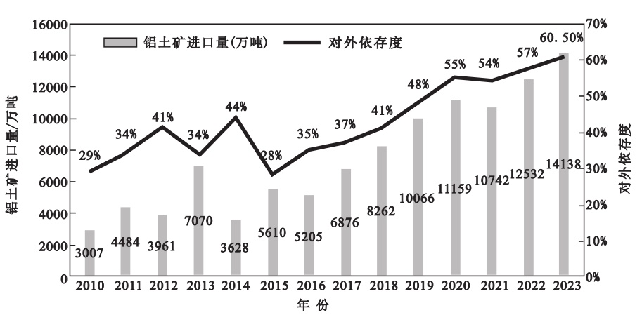全球最大需求量與資源匱乏及稟賦不佳的矛盾造成了我國成為全球最大的鋁土礦進(jìn)口國家,每年進(jìn)口量超過全球進(jìn)口總量的四分之三,特別是2019年以后,我國進(jìn)口鋁土礦已連續(xù)五年超過1億噸,2023年我國累計進(jìn)口鋁土礦14138萬噸,同比增長超過12.7%,再度創(chuàng)下我國鋁土礦進(jìn)口歷史新高。 在我國進(jìn)口鋁土礦量創(chuàng)新高的同時,我國鋁土礦的對外依存度也持續(xù)提升,2023年全年我國鋁土礦的對外依存度達(dá)已超過60% 。
