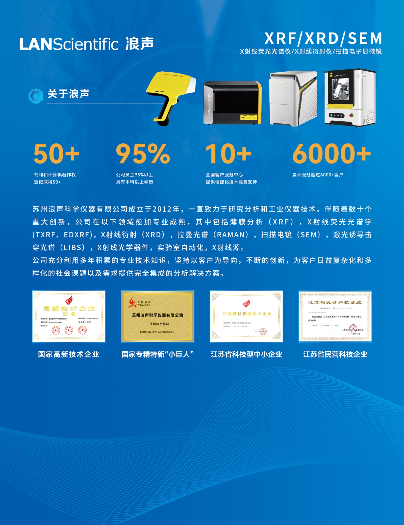 蘇州浪聲科學儀器有限公司成立于2012年,一直致力于研究分析和工業儀器技術。伴隨著數十個重大創新,公司在以下領域愈加專業成熟,其中包括薄膜分析(XRF),X射線熒光光譜學(TXRF、EDXRF),X射線衍射(XRD),拉曼光譜(RAMAN),掃描電鏡(SEM),激光誘導擊穿光譜(LIBS),X射線光學器件,實驗室自動化,X射線源。