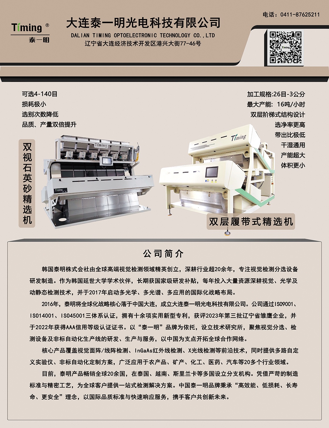 韓國泰明株式會社公司歷經(jīng)多年的發(fā)展,產(chǎn)品遍及世界20多個國家及地區(qū),并在泰國、越南、斯里蘭卡、印度、秘魯設(shè)立了分支機構(gòu)。泰明產(chǎn)品不僅應(yīng)用于大米、雜糧、豆類、堅果、脫水蔬菜、茶葉等傳統(tǒng)分選領(lǐng)域,同時也進軍石英砂,鹽、化工粉體粉粒、藥粉等細微物料的分選領(lǐng)域,以更高的質(zhì)量標準、更優(yōu)的安全標準為企業(yè)品質(zhì)準則,研發(fā)的X射線檢測機,液袋泄露檢測技術(shù)也獲得廣大高端藥業(yè)及食品行業(yè)用戶的認可。