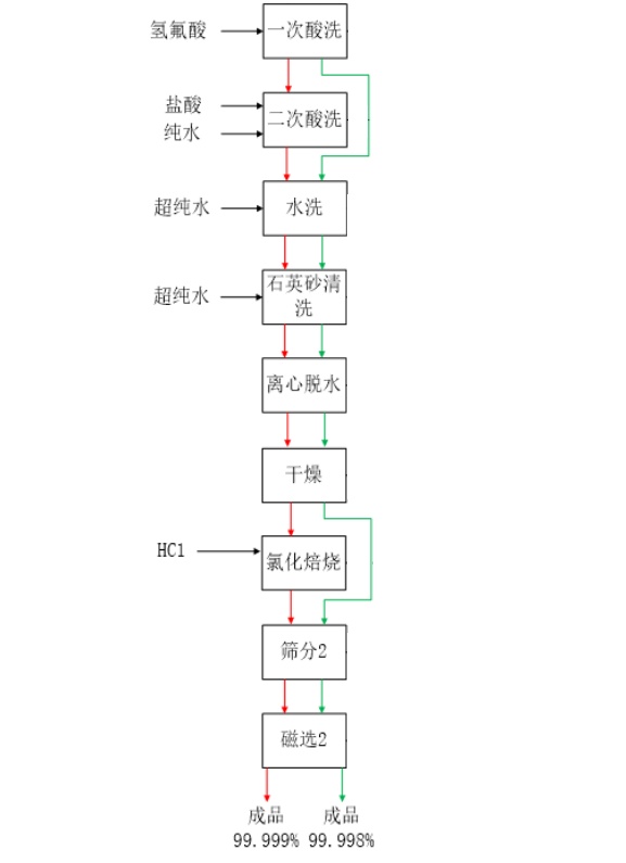 主要生產工藝有破碎、制砂、篩分、磁選、浮選、酸洗、水洗、脫水、干燥、氯化焙燒、包裝等,99.999%高純石英砂與99.998%高純石英生產工藝區別體現在99.999%高純石英砂為了提高純度需進行二次酸洗及氯化提純。